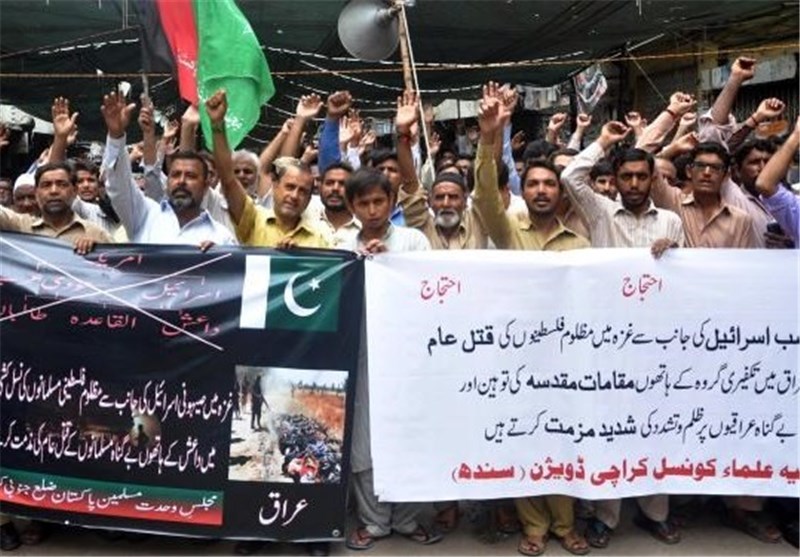 مسلمانان در شهر کراچی پاکستان روز جمعه پلاکاردهایی به دست گرفتهاند که حملات اسرائیلیها به سرزمینهای فلسطین را محکوم میکند.