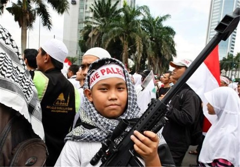 یک پسر مسلمان در اندونزی با یک تفنگ اسباببازی در دست در تظاهرات روز جمعه در کشورش برای محکومیت جنایات صهیونیستها در غزه شرکت کرده است.