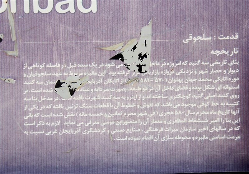 وی می افزاید: یکی از این سه کتیبه بالای درگاه، دومی بر روی طاق ها و سومی بر فراز قاب تزئینی واقع شده است.