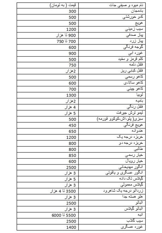به گفته امامی قیمت انواع میوه، فرنگی جات و سبزی در میادین میوه و تره بار به شرح زیر است: