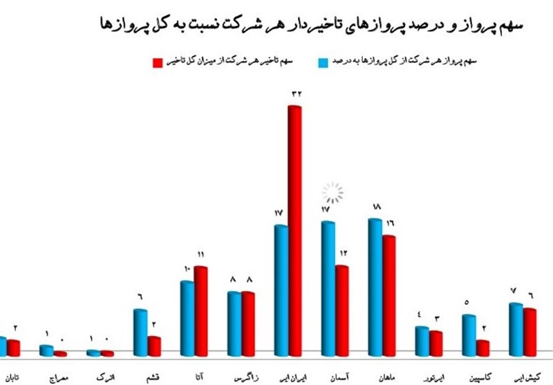 پس از ایران ایر، هواپیمایی آسمان با میانگین 99 دقیقه تاخیر در هر پرواز، آتا با 95 دقیقه و ایران ایرتور با 87 دقیقه تاخیر در رتبه های بعدی تاخیر پروازی قرار دارند.