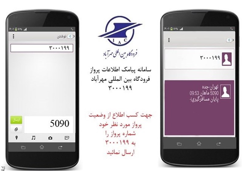 در روش دوم نیز مخاطب با ارسال نام شهر مبداء خود به همراه *به سامانه پیامک، تمامی اطلاعات پروازی مربوط به پروازهای ورودی به فرودگاه بینالمللی مهرآباد را از شهر مبداء دریافت میکند.