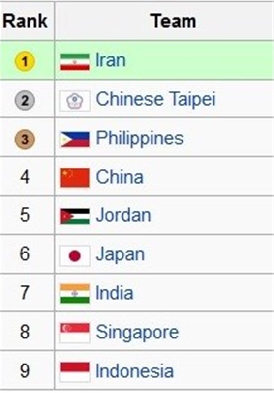 1- ایران 2- چین تایپه 3- فیلیپین 4- چین 5- اردن 6- ژاپن 7- هند 8- سنگاپور 9- اندونزی