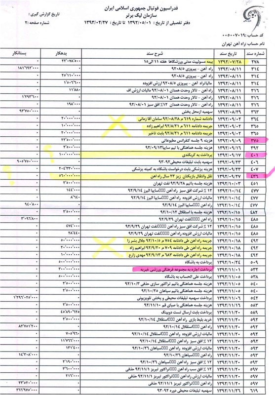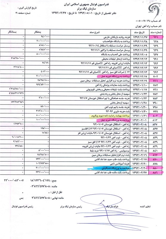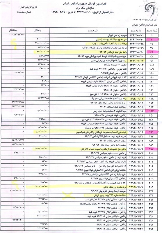 4. ردیف 436 به مبلغ 560 میلیون ریال احتمالاً بابت کسر 20% حق آموزش یکی از بازیکنان زیر 23سال باشگاه در وجه باشگاه دیگر صورت گرفته که اولاً معلوم نیست به حساب کدام باشگاه منظور شده ثانیاً قبل از کسر اجازه کتبی باشگاه راه آهن اخذ نشده است و ثالثاً میزان قراردادهای باشگاه راه آهن با بازیکنان فصل قبل 30% کاهش مبلغ قرارداد بدلیل رتبه در جدول صورت گرفته درحالی که سازمان لیگ فوتبال به این مهم توجه نکرده است.