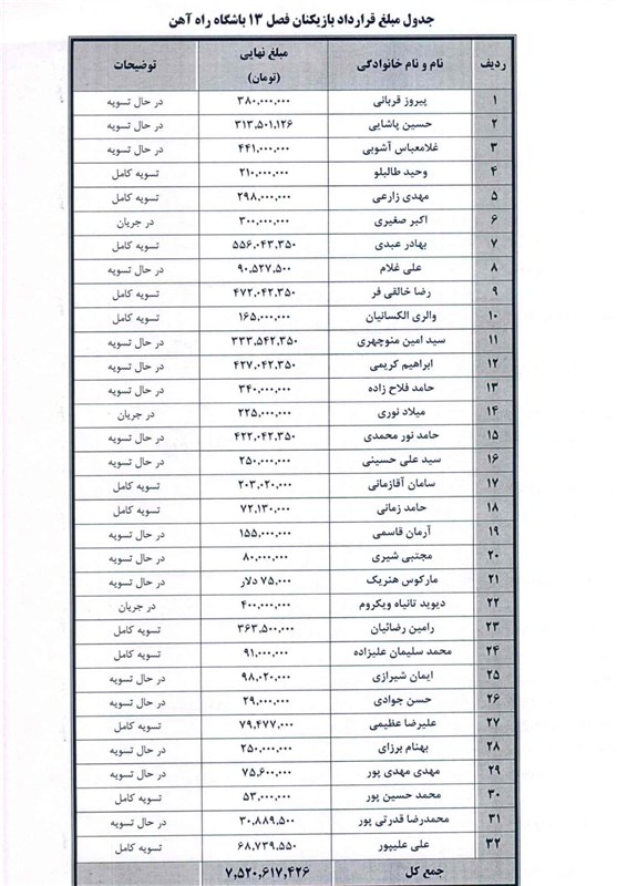 به گزارش خبرگزاری تسنیم و به نقل از سایت رسمی باشگاه راهآهن، این باشگاه اقدام به انتشار مبلغ نهایی قرارداد بازیکنان فصل سیزدهم خود کرد.
