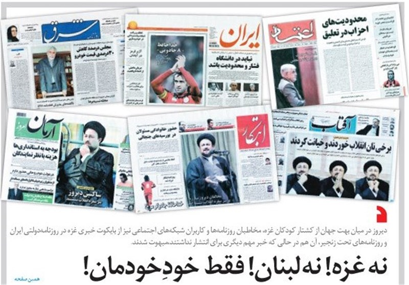 رفتار دیروز روزنامههای تحت زنجیر که مورد اعتراض شدید کاربران شبکههای اجتماعی قرار گرفت و حتی یکی از خبرنگاران روزنامه شرق نیز اعتراض خود را به این وضعیت در توئیتر منتشر کرد، نشان داد که مسئله غزه برای ایشان یک موضوع اسلامی یا حتی انسانی نیست که آن را در فجیعترین روز آن که یکصد تن از زنان و کودکان شجاعیه قتل عام میشوند، فراموش نکنند، بلکه یک بازی سیاسی است که با آن میتوانند به مخاطبانشان زاویه خود با انقلاب و آرمانهایش را نشان دهند. یک روز با هماهنگی از بالا همگی به آن میپردازند و روز دیگر دستور از همان بالا میشود: «نه غزه ! نه قدس ! نه لبنان ! فقط خود خودمان!؟» رفتاری که این روزها حتی در بیبیسیبیحیا نیز دیده نمیشود و این رسانه آلوده برای حفظ مخاطبانش مجبور شده هر روز آمار قتل عام غزه را تیتر یک خود کند. دیروز در حالی که روزنامهها و رسانههای جهان، غزه را تیتر یک خود کردند و حتی از حمله صهیونیستها به بیمارستانهای غزه خبر دادند، روزنامههای زنجیری وابسته به اشخاص شناخته شده ثابت کردند که وارث همان نشریاتی هستند که در دهه80 آرمانهای اسلامی و انسانی را به منافع شخصی و جناحی خودشان میفروختند و هرگاه پای یکی از نمادهای جهانی انقلاب اسلامی به میان میآمد، پای آنها میلغزید.