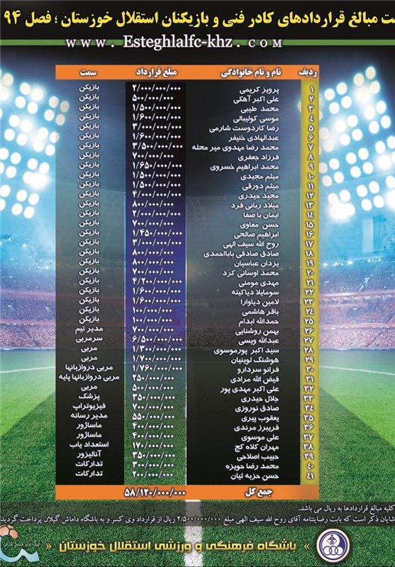 به گزارش خبرگزاری تسنیم و به نقل از سایت باشگاه استقلال خوزستان، با توجه به تاکید سازمان لیگ برتر و برای شفاف سازی و اطلاع عموم مردم فهیم و ورزش دوست کشورمان و زدودن جو شایعات پیرامون انعقاد قراردادهای نجومی، بدین وسیله باشگاه فرهنگی ورزشی استقلال خوزستان به عنوان یکی از پیشگامان شفاف سازی و حمایت از این حرکت ارزشمند، اقدام به انتشار لیست مبالغ کادر فنی و بازیکنان خود به شرح زیر مینماید.