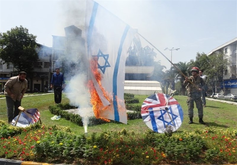 راهپیمان در پایان پرچم رژیم صهیونیستی و آمریکا را به آتش کشیدند.