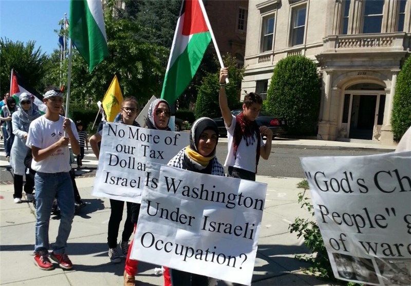 تظاهرات کنندگان ضد اسرائیلی با حمل پرچم و نمادهای خود، اسرائیل را به دلیل حمله به نوار غزه محکوم کردند و بسیاری از آنها نیز خواهان پایان کمک های دولت واشنگتن به تل آویو شدند.