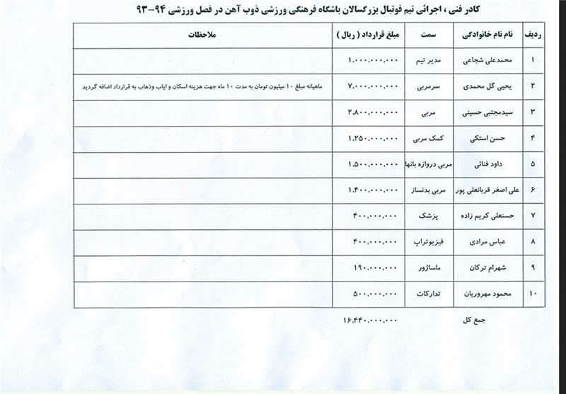 به گزارش خبرگزاری تسنیم و به نقل از سایت باشگاه ذوب آهن، این باشگاه در راستای شفاف سازی مبلغ قرارداد اعضای تیم فوتبال در فصل ورزشی 93-94، اقدام به انتشار مبلغ قرارداد بازیکنان و کادر فنی به شرح زیر کرد.