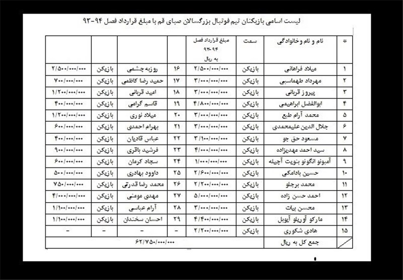 جدول اعلام شده مبالغ قرارداد باشگاه صبای قم بدین شرح است: