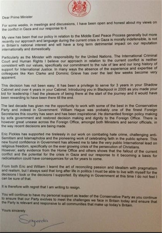وی در صفحه توئیتری خود تصویری از متن استعفا نامه خود خطاب به دیوید کامرون را منتشر کرد، در این متن آمده است: