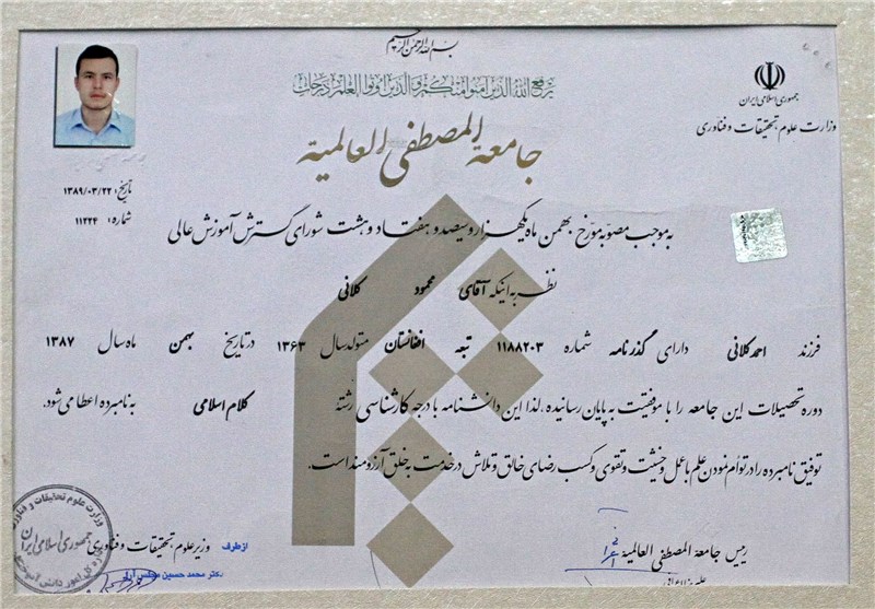 گواهی پایان دوره کارشناسی حجتالاسلام شهید محمود کلانی و دوران تحصیل در جامعه المصطفی در ایران