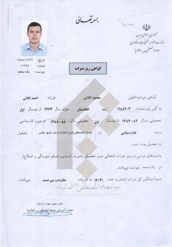 گواهی ریز نمرات حجتالاسلام شهید محمود کلانی در مقطع کارشناسی و دوران تحصیل در جامعه المصطفی در ایران