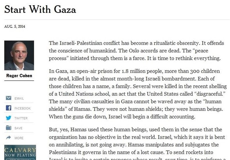 راجر کوهن نویسنده یهودی و باسابقه روزنامه نیویورک تایمز، یادداشتی را با موضوع غزه به رشته تحریر درآورده است. کوهن از جمله کسانی است که نسبت به ساخت شهرک نشین ها در سرزمین های اشغالی از سوی اسرائیل معترض بوده و خواستار پایان یافتن محاصره نوار غزه است.