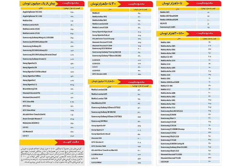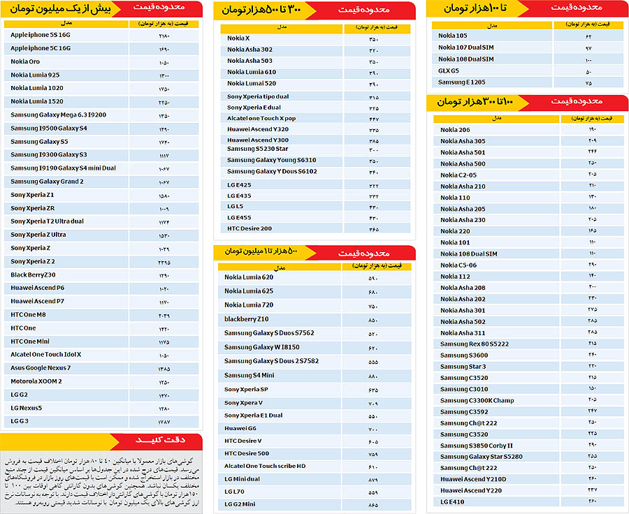 قیمت انواع موبایل در بازار 21 مرداد 93