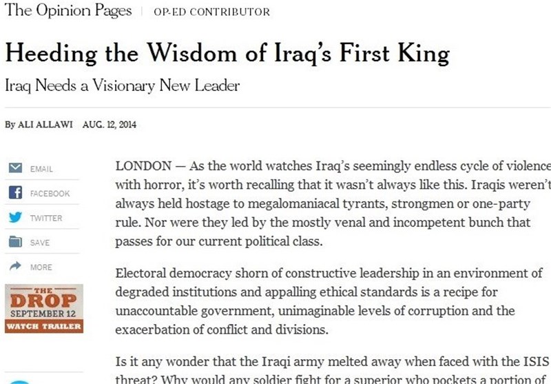 علی علوی وزیر بازرگانی و دفاع پیشین عراق یادداشتی در صفحه نظرات نشریه نیویورک تایمز منتشر کرده است. علوی در مطلب خود آورده است: دنیا چرخه پایان ناپذیری از خشونت را در عراق شاهد است اما باید یادآور شویم که در عراق همیشه وضع اینگونه نبوده و حاکمان ستمگر و قوی حاکم نبوده است. اینکه نیروهای امنیتی عراق که حدود یک میلیون عضو دارد و میلیارد ها دلار از سوی آمریکا و دولت عراق صرف تجهیز آن شده، نمی توانند بدون کمک های خارجی همچون ایران، روسیه و آمریکا در مقابل دولت اسلامی بایستند، تاسف برانگیز است. تنها یک جبهه توانست در مقابل دولت اسلامی بایستد: مرجعیت شیعه و تقاضای آن برای جهاد دفاعی و هزاران داوطلب که با درخواست آیت الله سیستانی به مبارزه با دولت اسلامی پرداختند.