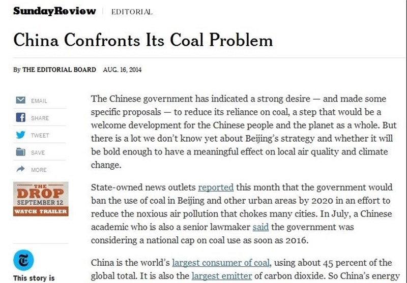 شورای سردبیری نشریه نیویورک تایمز در یادداشتی به موضوع چین و منابع زغال سنگ آن پرداخته اند. دولت چین تمایل زیادی برای کاهش وابستگی خود به زغال سنگ نشان داده و در این راه پیشنهاداتی نیز ارائه کرده اند. این امر می تواند زمینه توسعه برای مردم چین و سراسر دنیا را به همراه داشته باشد. اما هنوز جزئیات چندانی از استراتژی پکن در دسترس نیست و مشخص نیست آیا این امر می تواند تاثیر چشم گیری بر کیفیت هوای محیط و تغییرات آب و هوا داشته باشد یا خیر.