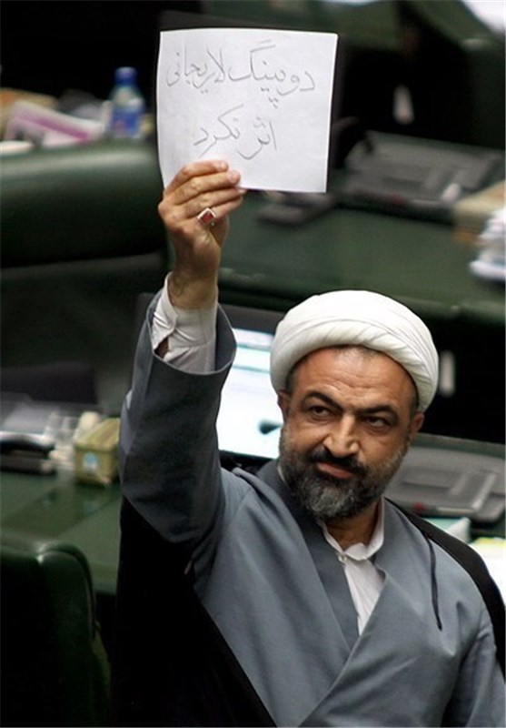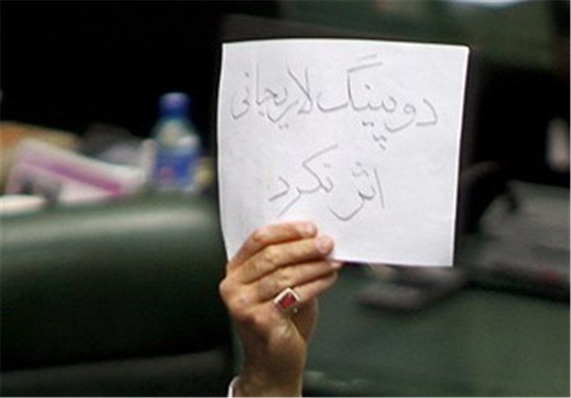 *در پایان جلسه حمید رسایی نماینده مردم تهران کاغذی را بالای سر خود نگه داشته بود که بالای سر آن نوشته شده بود دوپینگ لاریجانی اثر نکرد.
