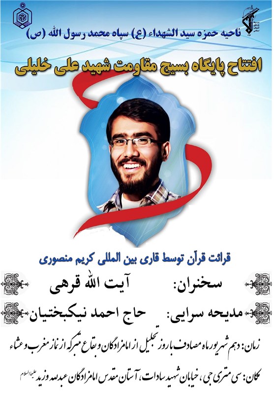 مراسم افتتاح این پایگاه که متبرک به نام شهید امر به معروف و نهی از منکر، علی خلیلی است به همراه مراسم یادبود این شهید والامقام با سخنرانی آیت الله قرهی، مدیحه سرایی احمد نیکبختیان و قرائت قرآن کریم منصوری بعد از نماز مغرب و عشا برگزار میشود.