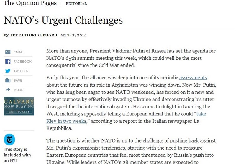 نیویورک تایمز سرمقاله ای به قلم شورای سردبیری این نشریه دارد. بیش از هر کس دیگر، ولادیمر پوتین دستور جلسه شصت و پنجمین نشست ناتو را تشکیل داده است. نشستی که مهم ترین جلسه این سازمان از زمان پایان جنگ سرد محسوب می شود.