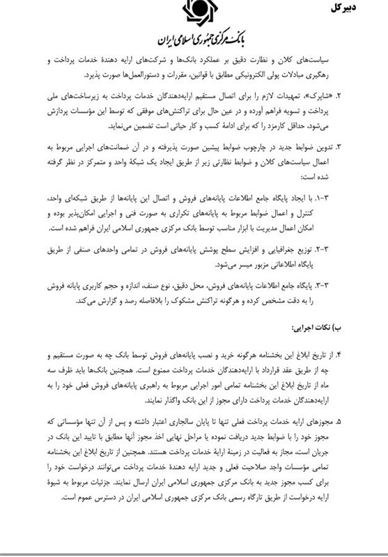 16 بهمن سال 90 بخشنامه ای از بانک مرکزی با امضای دبیر کل این بانک به دست بانکداران رسید که محتوای آن ضوابط جدید درباره خدمات الکترونیکی بود. این بخشنامه با هدف ساماندهی پایانه های فروش الکترونیکی در نظام بانکی کشور، نظارت دقیق و همه جانبه بر عملیات بانکی از طریق پایانه های فروش ابلاغ شده بود.