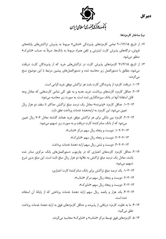 همچنین در بخش دیگری از این بند تاکید شده که از تاریخ 15 اسفند 90 کارمزدهای پذیرش کارت در تراکنش های خرید که از پذیرندگان کارت دریافت می شود مطابق با دستورالعمل زیر محاسبه شده و دستورالعمل های پیشین مرتبط با این موضوع نسخ می گردند؛