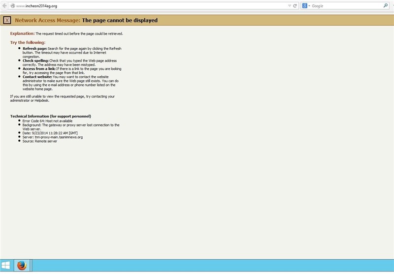 به گزارش خبرنگار ورزشی خبرگزاری تسنیم، در حالی که روز چهارم بازیهای آسیایی اینچئون رو به پایان است و در ادامه روند انتقاد برانگیز میزبانی کره جنوبی ، سایت رسمی این بازیها به آدرس « www.incheon2014ag.org» از دسترس خارج شد. این مشکل دقایق طولانی ادامه داشت و سایت مسابقات پس از حدود 45 دقیقه بار دیگر در دسترس مخاطبان قرار گرفت که البته وضعیت پایداری ندارد.
