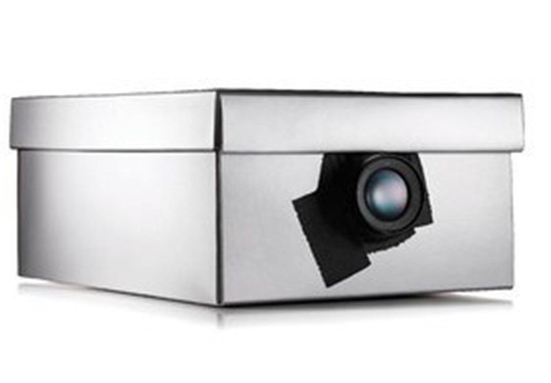 1-ابتدا یک حفره در یک سمت جعبه کفش ایجاد و یک ذرهبین در آن قرار دهید و دور آن را با نوار چسب بپوشانید تا مطمئن شوید نور به هیچ عنوان از دور ذره بین وارد جعبه نشود.