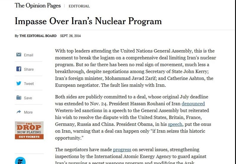 شورای سردبیری نشریه نیویورک تایمز در سرمقاله خود به موضوع مذاکرات هسته ای ایران اشاره داشته است که ادامه خلاصه ای از آن مطرح می شود:
