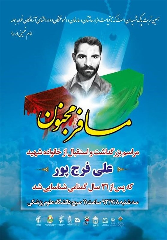 به گزارش خبرگزاری تسنیم، طبق اعلام کمیته جستجوی مفقودین ستاد کل نیروهای مسلح پیکر پاک شهید بزرگوار علی فرج پور حقه فرزند اسدالله از طریق آزمایش DNA شناسایی شد. این شهید بزرگوار در17 فروردین 1344 در تبریز متولد شد و از طریق لشکر 31 عاشورا(مشهور به لشکر خوبان) با عضویت بسیجی به جبهههای نبرد حق علیه باطل اعزام شد و در 20 اسفندماه سال62 در عملیات خیبر و در جزیره مجنون به درجه رفیع شهادت نائل شد.