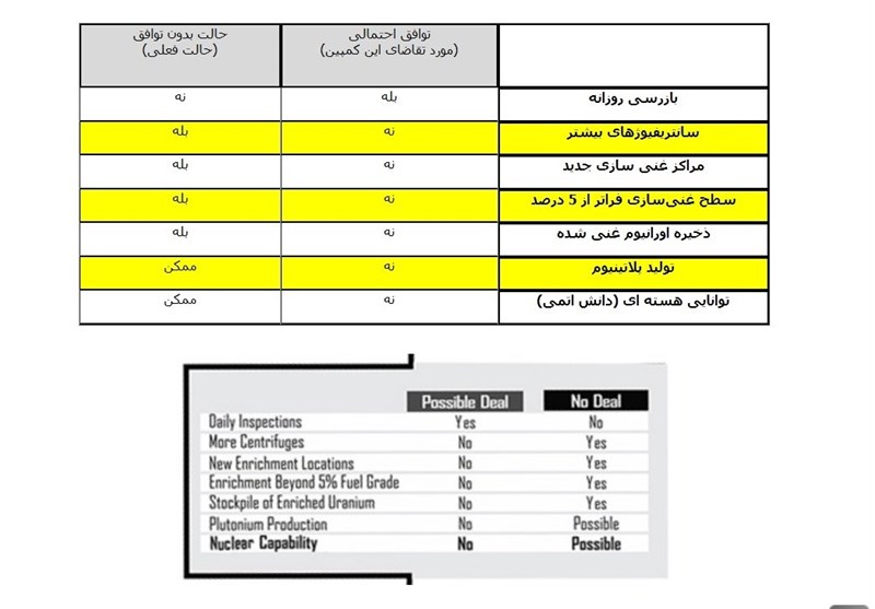 بر طبق این جدول، امضا کنندگان اعلام کرده اند توافقی را قبول دارند که در آن بازرسی روزانه (بدون مشخص کردن نظامی یا غیرنظامی بودن اماکن) صورت پذیرد، سانتریفیوژهای ایران بیشتر نشود، مراکز غنی سازی جدید تأسیس نگردد، سطح غنی سازی از 5 درصد فراتر نرود، ایران ذخیره اورانیوم غنی شده نداشته و تولید پلاتینیوم نکند و از همه مهمتر توانایی هسته ای که همان دانش اتمی بومی شده در ایران است را واگذار کند و آن را از بین ببرد.