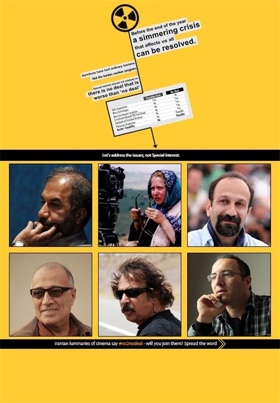 به گزارش گروه رسانههای خبرگزاری تسنیم به نقل از جهان نیوز، روزگذشته خبری در شبکههای مجازی از جمله توئیتر و فیسبوک منتشر شد مبنی بر اینکه 6 فیملساز ایرانی یعنی مجید مجیدی، محمدمهدی عسگرپور، سیدرضا میرکریمی، رخشان بنی اعتماد، عباس کیارستمی و اصغر فرهادی در کمپینی حمایت خود را از "توافق هسته ای در هر شرایطی" اعلام کرده اند.