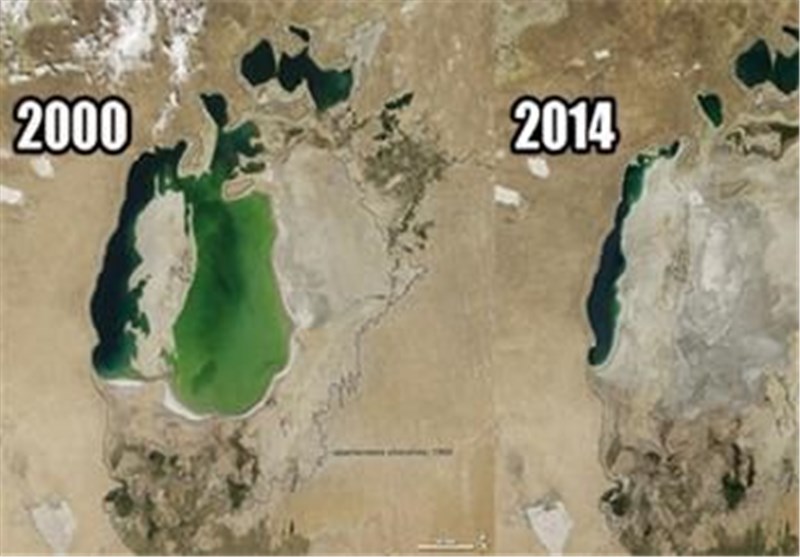 به طوری که در سال 2000 میلادی، مساحت آن به 25 درصد مساحت اصلی کاهش یافته و درصد شوری آب آن نیز 5 برابر شد. اما اکنون تصاویر فضایی ناسا حقایق دیگری را رونمایی می کند. آیا تصویری که مشاهده می شود متعلق به چهارمین دریاچه بزرگ دنیا است؟ باور این موضوع کمی سخت است که در این مکان و در گذشته دریاچه پهناوری وجود داشته است. در تصویر گرفته شده توسط کاوشگرهای ناسا، تغییرات در مدت 14 سال یعنی از سال 2000 تا 2014 میلادی به خوبی دیده می شود.