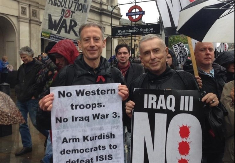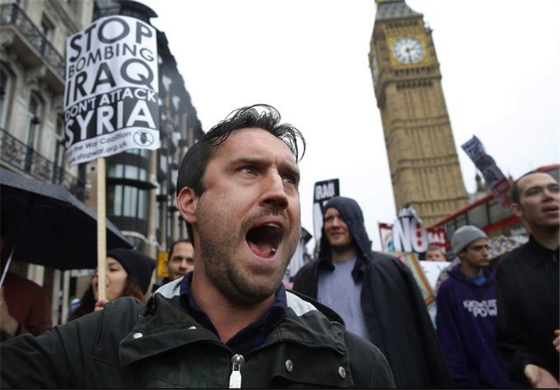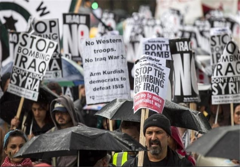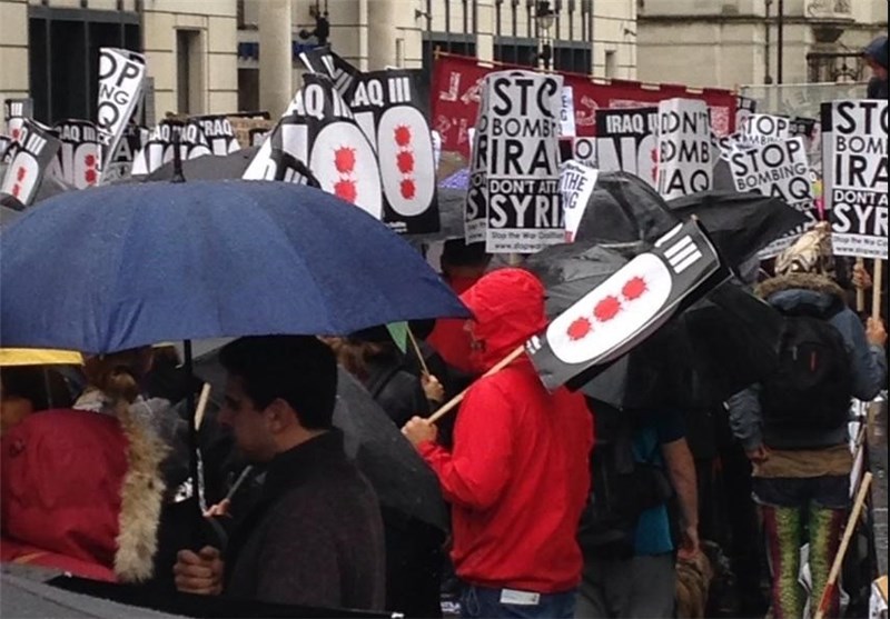 تظاهرات از مرکز لندن به سوی "داونینگ استریت" مقر دفتر "دیوید کامرون" نخست وزیر انگلیس برگزار شد. «جان ریس» روزنامه نگار و فعال ضد جنگ انگلیسی معتقد است که دلایل واقعی جنگ علیه داعش در عراق این است که آنها نمیخواهند «موقعیت راهبردی خود در خاورمیانه و چاههای نفت را از دست بدهند و آنها همچنین برای حمله به سوریه آماده میشوند.»