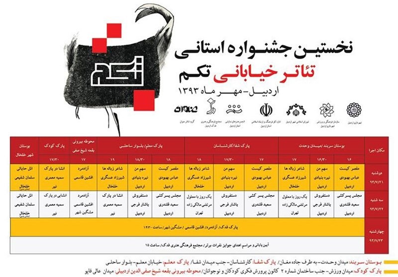 خبرگزاری تسنیم: نخستین جشنواره تئاتر خیابانی "تکم" با همکاری سازمان فرهنگی-ورزشی شهرداری اردبیل و گروه تئاتر عنوان در اردبیل برگزار شد.