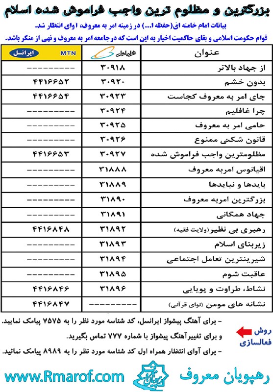 آن دسته از مخاطبانی که مایلند آواهای انتظار در خصوص جهاد همگانی، باید و نبایدهای امر به معروف، شیرینترین تعامل اجتماعی، حامی امر به معروف، جایگاه اصلی این فریضه در جامعه و ... در انتظار پاسخ تماس خود قرار دهند با تولید آواهایی از سوی مجموعه «رهپویان معروف» میتوانند به صورت رایگان از این تولیدات استفاده کنند.