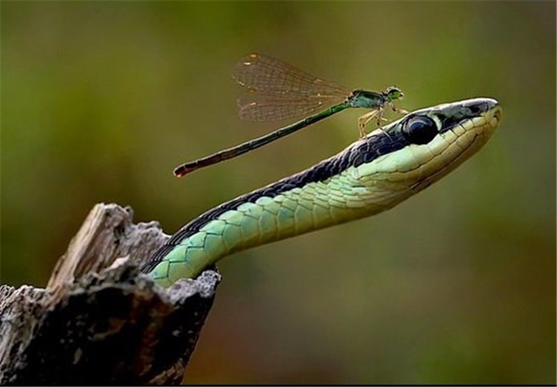 سنجاقک شجاع برای استراحت کردن، روی سر یک مار فرود آمده است. (Solent News)