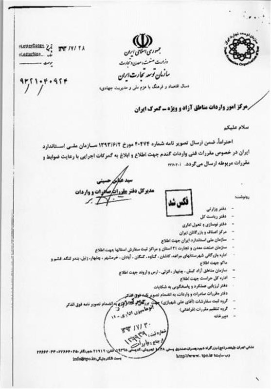 به گزارش خبرنگار اقتصادی خبرگزاری تسنیم، علی معقولی معاون مدیر کل مرکز واردات و اممور مناطق آزاد و ویژه گمرک، تصویر نامه 40924/210/93 مورخ 28/7/93 دفتر مقررات صادرات و واردات سازمان توسعه تجارت ایران به همراه تصویر نامه 40474 مورخ 2/6/93 سازمان استاندارد ایران در خصوص مقررات فنی واردات گندم را ارسال و ابلاغ کرد، در این خصوص بر اساس مفاد نامه فوق الذکر و رعایت کامل سایر مقررات اقدام لازم صورت پذیرد.