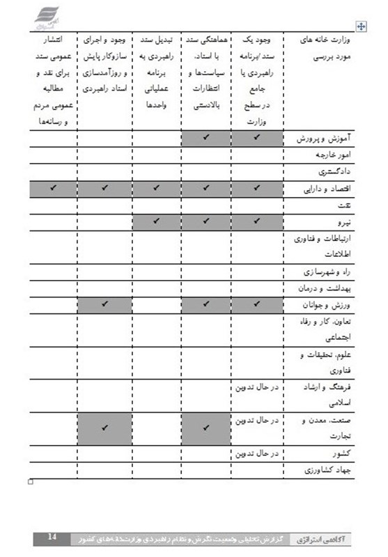به گزارش خبرگزاری تسنیم، در گزارش آکادمی استراتژی آمده است: این گزارش به این سوال مهم می پردازد که وزارت خانه های کشور به عنوان مهم ترین نهادهای حاکمیت و راهبری کشور در زمینه مدیریت راهبردی (نگرش و نظام مدیریت راهبردی) در چه شرایطی به سر می برند. آیا وزارتخانهها دارای یک برنامه راهبردی یا یک برنامه جامع یا یک سند راهبردی مدون و مصوب می باشد که اهداف و راهبردهای بلندمدت (دست کم سه ساله) کل وزارت خانه را مشخص کند؟ آیا سند راهبردی وزارت خانهها با اسناد بالادستی نظام از جمله سیاست های کلی نظام هماهنگ است؟ آیا سند راهبردی وزارت خانه تبدیل به برنامه های عملیاتی برای معاونت ها، سازمان ها، مراکز زیرمجوعه، وابسته و مرتبط با وزارت شده است؟ آیا نظامی برای کنترل اجرای این برنامه یا سند راهبردی وجود دارد؟ آیا سازوکاری برای به روز کردن یا اصلاح برنامه راهبردی یا سند راهبردی در طول زمان وجود دارد؟
