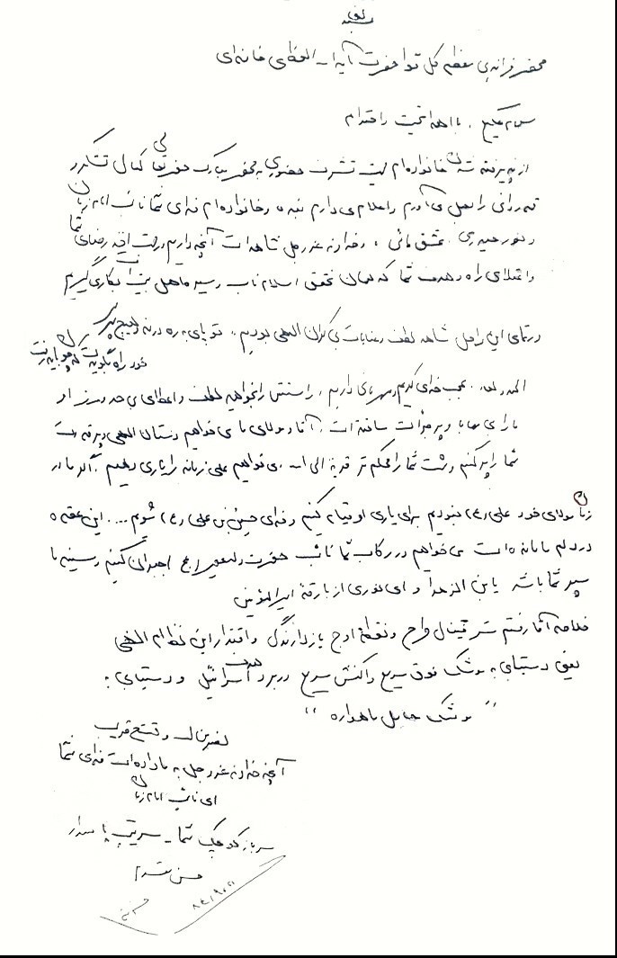 از پذیرفته شدن خانواده ام جهت تشرف حضوری به محضر حضرت عالی کمال تشکر و قدردانی را بعمل می آورم و اعلام می دارم بنده و خانواده ام فدای شما نائب امام زمان و نور حیدری ، عشق مائی. خداوند عزوجل شاهد است آنچه داریم درجهت اخذ رضایت شما و اعتلای راه و هدف شما که همان تحقق اسلام ناب و سیره اهل بیت است بکار میگیریم.