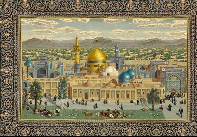 در گرداگرد این هفت تصویر، فرشتگان با نگاره های برگ مانند مشاهده می شوند که گویی در حال عبادت و راز و نیاز با این اماکن هستند. این قالی توسط استاد محمود فرشچیان طراحی و توسط حاج مهدی صفدرزاده حقیقی بافته و اهدا شده است.