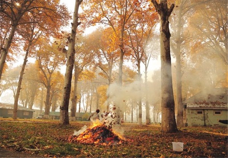 مردم محلی دانشگاه کشمیر در سرینگر در حال سوزاندن برگهای چنار است