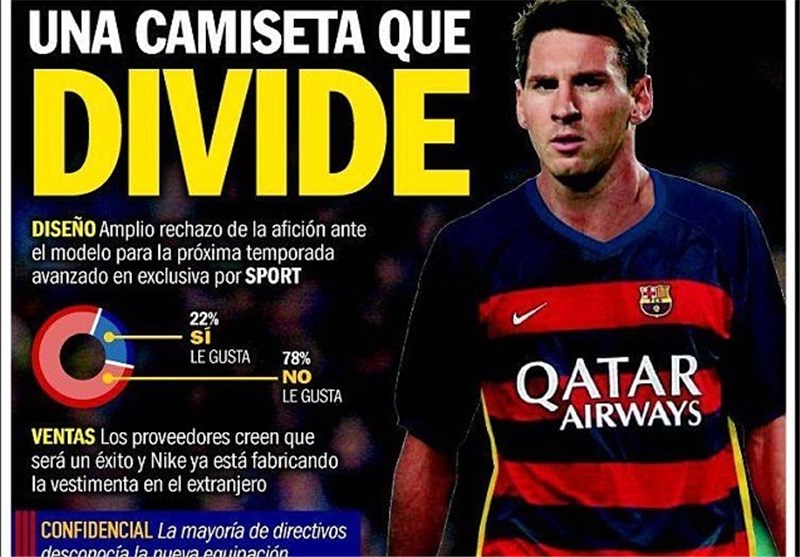 خبرگزاری تسنیم: بر اساس نظرسنجی یک روزنامه چاپ کاتالونیا 78 درصد هواداران بارسلونا مخالف سنت‌شکنی باشگاه در تغییر طرح پیراهن آبی و اناری‌پوشان هستند.
