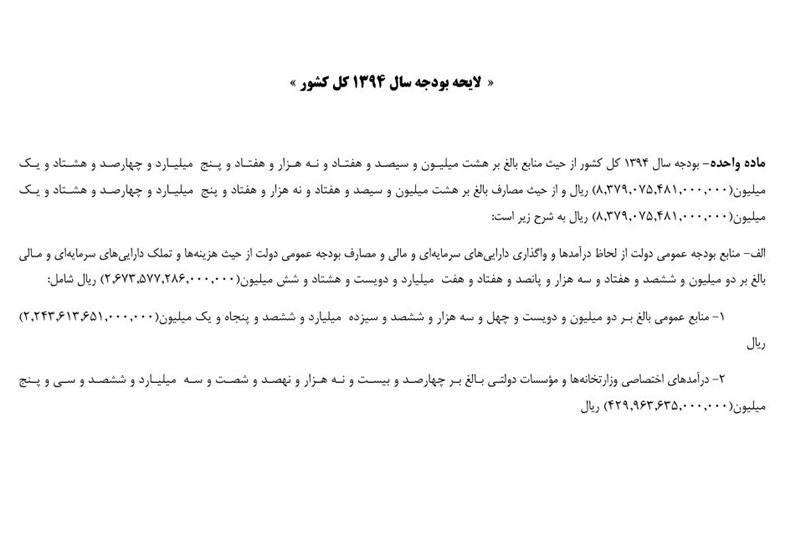 به گزارش تسنیم، دولت بودجه سال 94 کل کشور را از حیث مبلغ بالغ بر هشت میلیون و سیصد و هفتاد و نه هزار و هفتاد و پنج میلیارد و چهارصد و هشتاد و یک میلیون (8379075481000000) ریال و از حیث مصارف بالغ بر هشت میلیون و سیصد و هفتاد و نه هزار و هفتاد و پنج میلیارد و چهارصد و هشتاد و یک میلیون (8379075481000000) ریال بهشرح پیشنهاد داده است؛