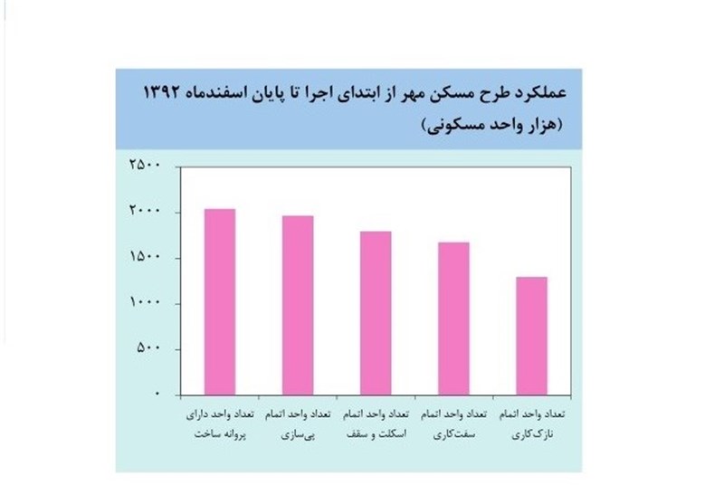 آمار عملکرد طرح مسکن مهر از ابتدا تا پایان سال 92 نشان می دهد پروانه ساخت 2 میلیون و 41 هزار و 4 واحد مسکونی در این طرح صادر شده است. از این میزان تعداد یک میلیون و 965 هزار واحد مسکونی در مراحل ساخت (پیسازی و بعد از آن) قرار گرفتهاند که از این تعداد یک میلیون و 296 هزار و 5 واحد مسکونی نازککاری را نیز پشت سر گذاشتهاند.