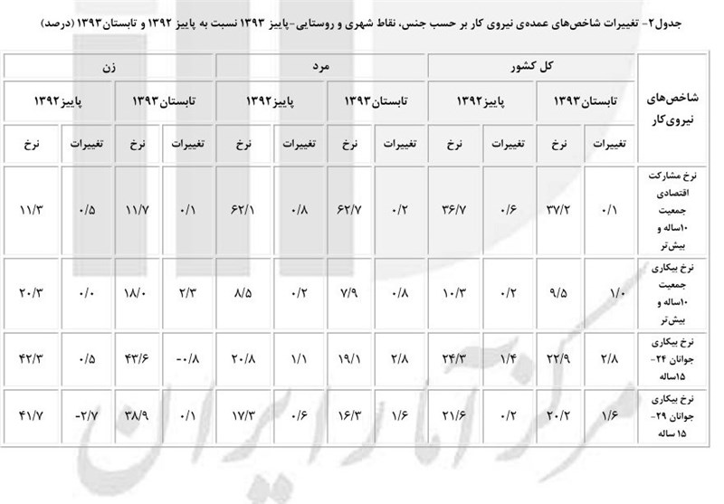 نرخ بیکاری مجموع نیز در پاییز 93 نسبت به تابستان 1 درصد و نسبت به پاییز پارسال 0.2 درصد رشد داشته است.
