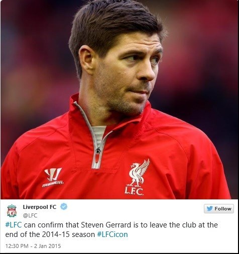 در صفحه توئیتر باشگاه لیورپول در خصوص خبر جدایی جرارد که اولین بازیاش را در آنفیلد در سال 1997 انجام داد، پیامی با این مضمون قرار گرفته است: باشگاه فوتبال لیورپول میتواند تأیید کند که استیون جرارد در پایان فصل 15-2014 این تیم را ترک میکند.