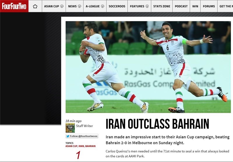 به گزارش خبرگزاری تسنیم، به دنبال پیروزی 2 بر صفر تیم ملی ایران مقابل بحرین در دومین بازی از گروه سوم جام ملتهای آسیای 2015، سایت نشریه «فور فور تو» انگلیس به تمجید از عملکرد شاگردان کارلوس کیروش پرداخت و آنها را شایسته کسب این پیروزی دانست.