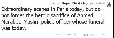 به گزارش خبرنگار فرهنگی خبرگزاری تسنیم، روپرت مرداک سرمایهدار آمریکایی ــ استرالیایی و سهامدار اصلی شرکت نیوز کورپوریشن دو روز گذشته در توئیتی که در صفحه شخصی خود منتشر کرده بود با اشاره به حوادث تروریستی چارلی ابدو گفته بود: شاید اکثر مسلمانان خواهان صلح باشند اما تا زمان تشخیص و نابود کردن سرطان گروههای جهادی روبهرشد، باید مسئولیت آنها را بپذیرند.